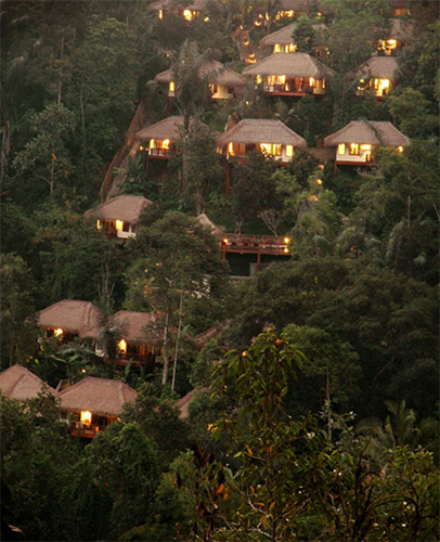 Each of the hotel's 18 chalets has a hanging balcony, offering a breathtaking view from the slopes of the river valley onto the rainforest canopy and into the jungle. The natural wildness of the jungle contrasts vividly with the comforts and relaxation the hotel offers. The hotel has an open air Jacuzzi and swimming pool, with dramatic views over the rain forest. The spa offers a wide range of traditional treatments for the total relaxation of body, mind and soul.
