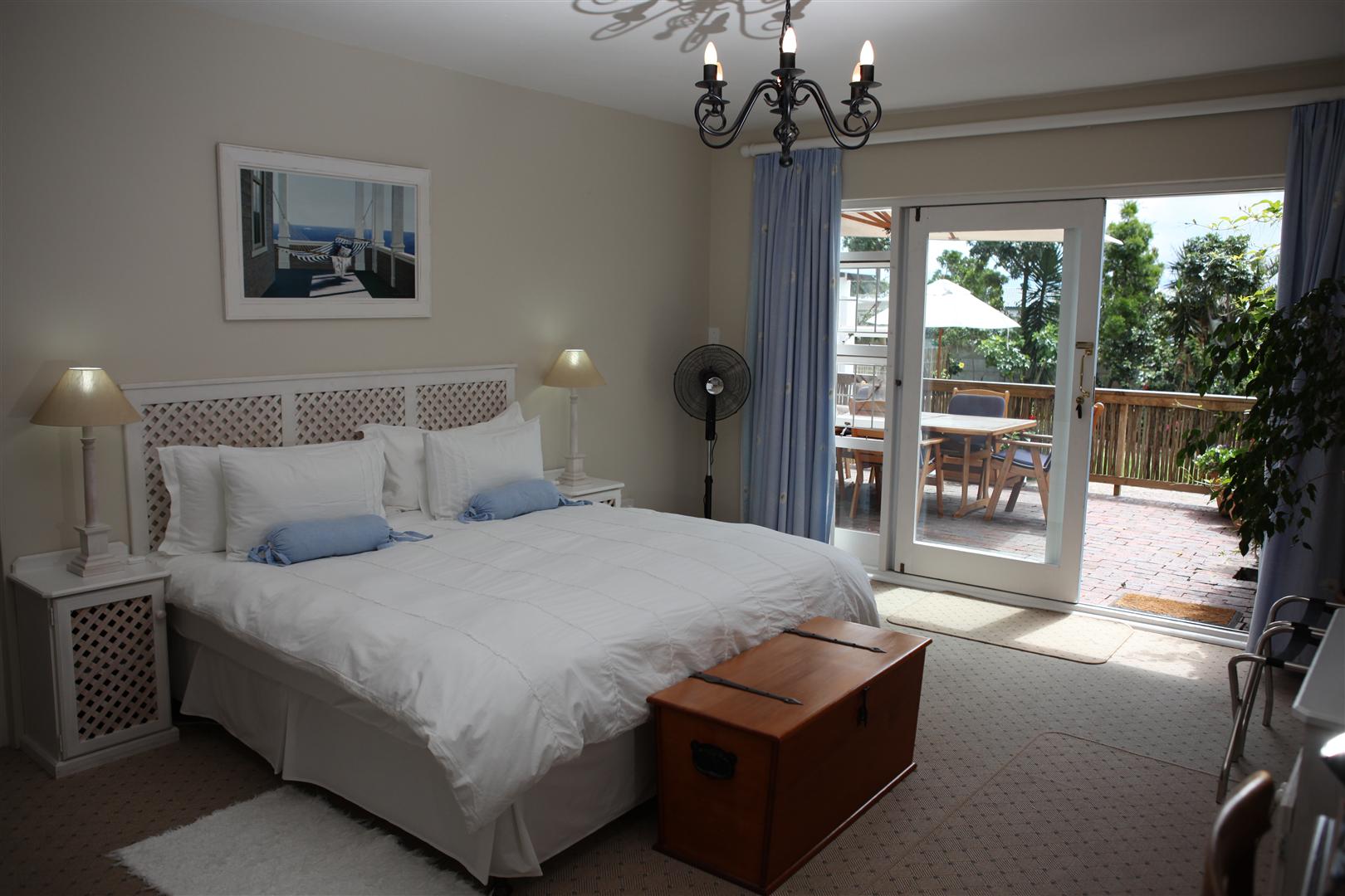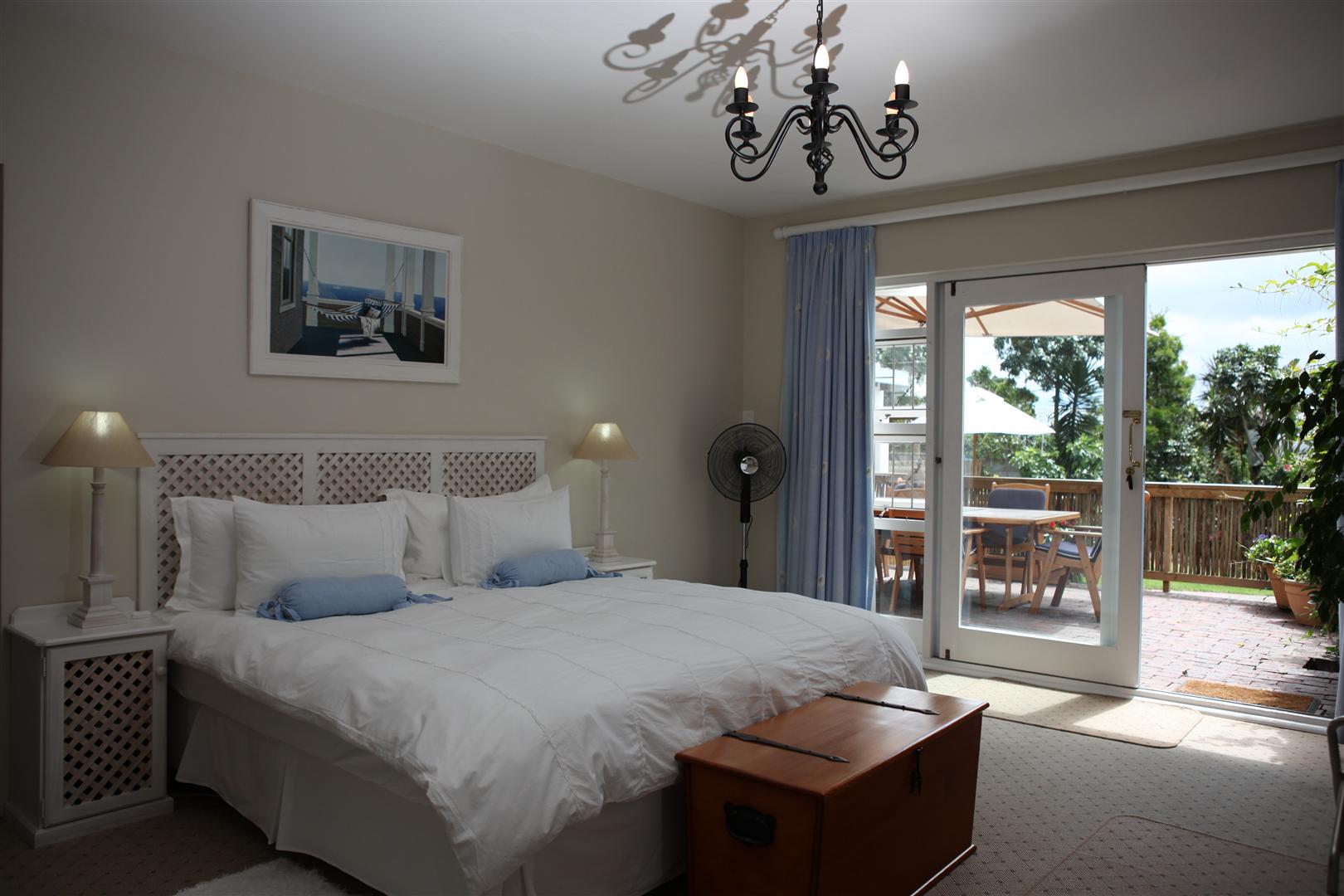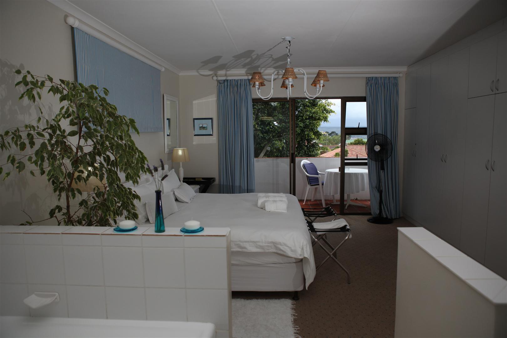 The upstairs Deluxe Suite features a balcony facing the magnificent Keurbooms lagoon. Wake up to the crimson light of a Plett Sunrise flooding your room. Large shower and corner bath.