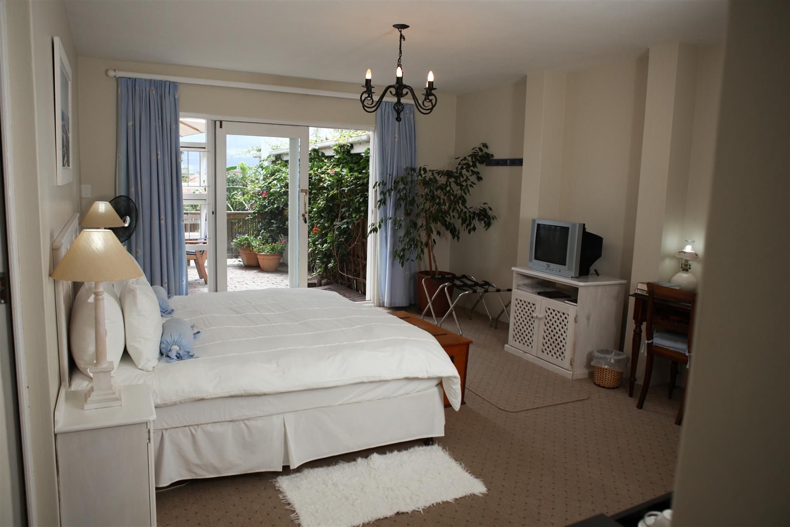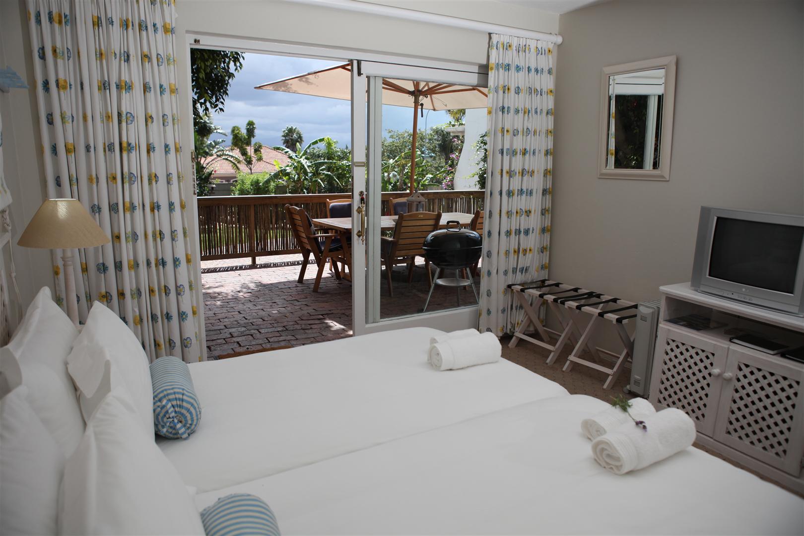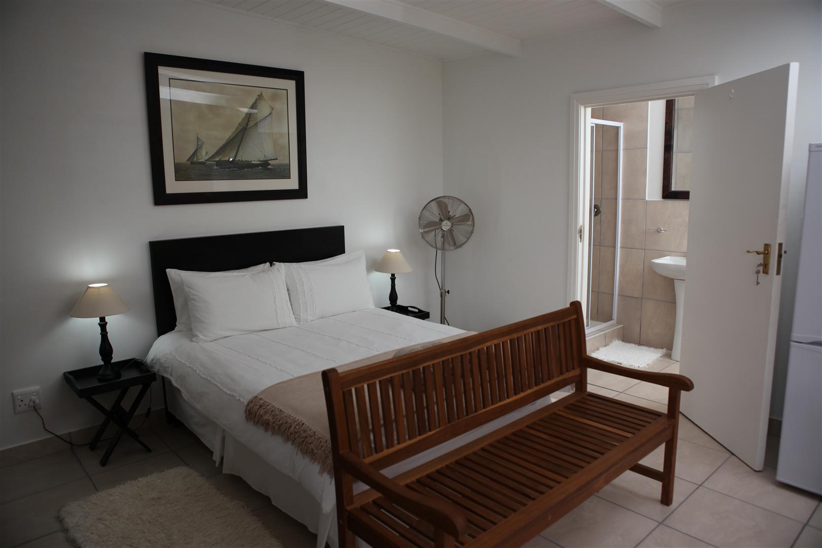The upstairs Deluxe Suite features a balcony facing the magnificent Keurbooms lagoon. Wake up to the crimson light of a Plett Sunrise flooding your room. Large shower and corner bath.
